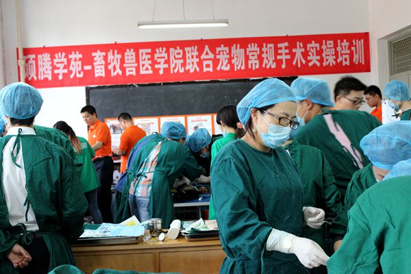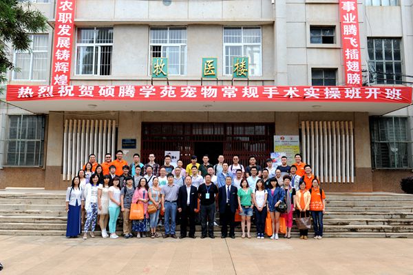 在学校迎接特色评估期间的6月18日至20日,畜牧兽医学院与全球最大宠物动保公司——中国硕腾学苑联合,聘请河南农业职业技术学院田超老师,为来自全国11个省市宠物医师及畜牧兽医学院师生开展常规手术实操培训。培训的口号是:牧医进宝校企校三联合促云南农职发展铸辉煌,硕腾生金强中强再结缘为宠物事业腾飞插翅膀!