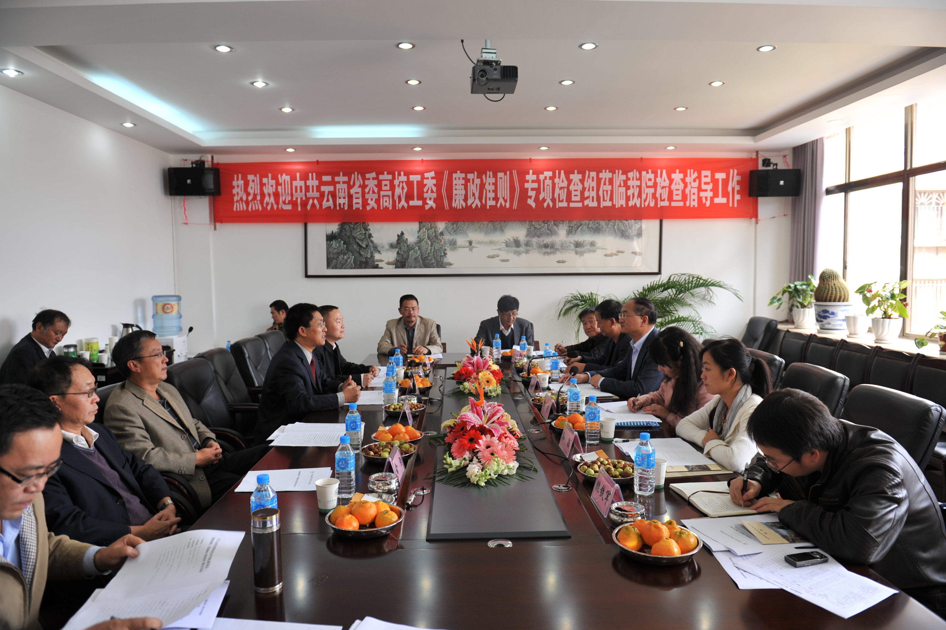 通知中心2011年10月21日下午,云南省委高校工委《廉政准则》专题检查组莅临我院茭菱校区检查指导工作。学院党委书记崔金赋、院长彭志远、党委副书记赵刚、副院长赵莉、副院长俞浩出席,党(院)办主任凌军、组织部长张建才、纪检监察审计处处长李昆、副处长黄富金、园艺与园林工程系主任许邦丽、对外交流合作处处长许建民、基础部主任董玉洲、宣传部副部长蔡永生、计划财务处副处长程春慧、后勤管理处副处长苏诚等参加了会议,省委高校工委检查组以李建宇为组长、何英富、卿茜、赵斌、孙颢、姚铁军等专家组成员对学院检查指导。崔金赋书记主持会议。
