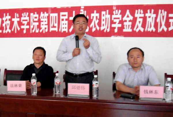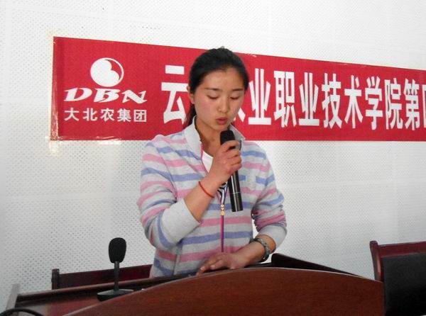 接着,大北农集团云南分公司总经理邱德伟发言,他介绍了大北农集团企业文化的核心,尊重知识和人才,人才是企业惟一的资源,大北农将视校企合作的深入,不断增加奖助学金;希望校企合作共建不断取得新的突破。