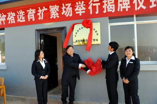 金日扬帆,猪事顺利!2012年10月26日清晨8点30分,迎着朝阳,满怀欢喜,满怀希望,畜牧兽医系在新落成的滇陆种猪扩繁场大门外举行了一个简短但却意义非凡的仪式——滇陆种猪选育扩繁场揭牌仪式。仪式由系主任赵跃主持。