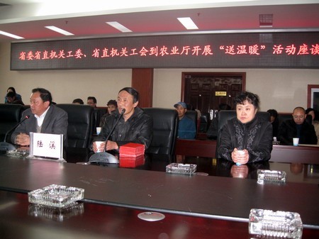 1月17日下午3:30,省农业厅会议室。云南省委省直机关工委、省直机关总工会开展“送温暖”活动隆重举行,省农业厅及直属单位困难职工享受了来自上级的温暖与关怀。省直机关工委副书记程猛、省直机关总工会主席陆溪、省农业厅文雅芹副巡视员、机关党委专职副书记张延斌等领导同志出席了座谈会。领导同志发表了感人的慰问讲话,向与会的困难职工发放了慰问金和慰问品。学院16名困难职工代表参加了会议。会议上接受慰问的困难职工对党和政府、工会的关怀表示感谢;学院工会常务副主席冯志宏同志代表学院工会及接受慰问的学院困难职工感谢上级的关怀,表达了学院困难职工克服暂时遇到的困难,以自强不息的精神建设和谐社会,追求幸福生活的决心。