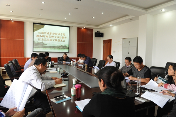2015年9月9日下午,学校在茭菱校区行政楼4楼会议室召开2014年财务收支审计报告(征求意见稿)交换意见会。参加会议的有上会会计事务所云南分所审计组,学校领导院长李永忠、纪委书记赵刚、副院长何明东,参加会议的部门是党委办公室(院长办公室)、组织部、纪检监察审计处、计划资产财务处、后勤管理处、园林园艺学院、畜牧兽医学院、云南省农职业教育培训中心。