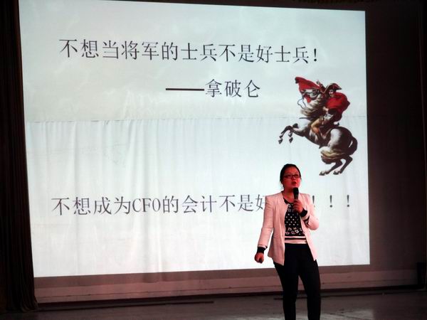 曾蕾老师从学生最关心的就业问题入手,用自己多年积累的数据客观分析了财务管理专业毕业生的就业前景;对财务管理专业学生未来的职业发展之路进行了规划;帮助财务管理专业学生剖析成为CFO的道路上自己需要具备的知识以及能力。曾老师把财会人员分为了“九段”(即九个级别),并列举了每个“段位”的财务人员需要具备的能力。风趣而形象的分级,既为财务管理专业学生提供了职业生涯规划的远景,也告诉学生:不想当CFO的财务人员不是好财务人员,想成为CFO就必须具备成为CFO的实力。