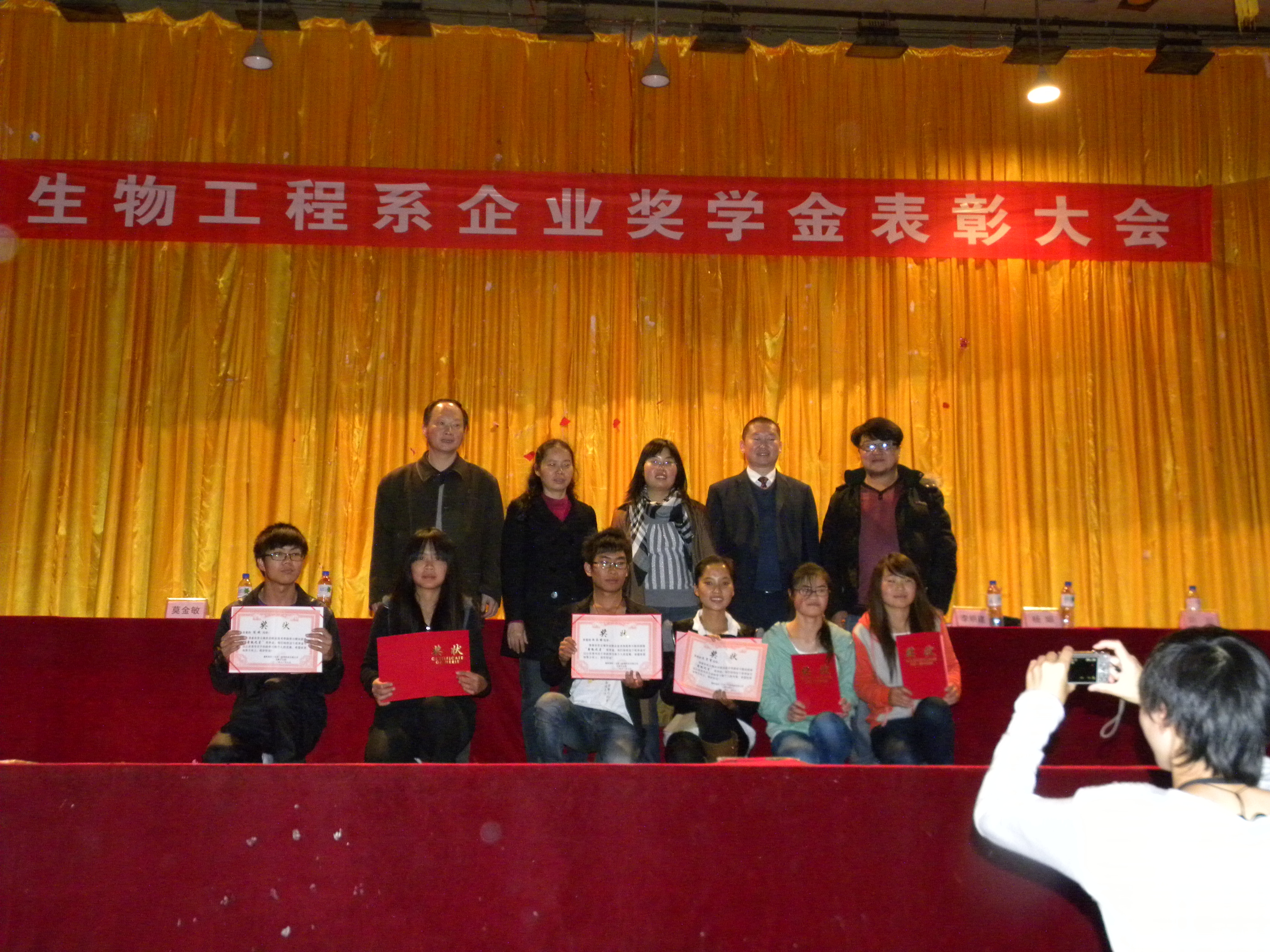 2012年11月7日中午1:00在小哨校区大礼堂,生物工程系隆重举行鑫凯高科北京作物有限公司云南分公司和昆明金实鼎业农资连锁有限公司两家企业给学生颁发奖学金的大会。参加会议的有企业代表、生物工程系领导、辅导员和全系同学。会议由生物工程系党总支书记许邦丽教授主持。
