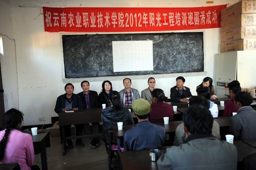 崔书记在结业仪式上用朴素而亲切地乡音向学员介绍了我院悠久而光荣的百年办学历史,介绍了我院优良的办学条件和雄厚的师资力量,向富民县领导和广大群众强调了我院百年致力于“耕道、养德、理想、开拓”的办学宗旨,致力于服务“三农”、“百年务农,耕养不辍,以人为本”的优良传统。介绍了我院在培养高端农业科技人才,为建设美好云南,建设社会主义新农村所作出的积极贡献。崔书记指出,我院在半个月投入近50万元培训了14个“阳光工程”农民科技系列培训班,就是践行我院百年办学宗旨,进一步扩大我院的积极影响,为富民县“三农”发展做一点实实在在的事情!希望在座的学员今后在生产中有什么困难和问题,主动与我院的专家教授联系,我们会热情帮助解决!同时,也希望大家来学院做客,常来学院走走;欢迎在座的各位和亲朋好友的子女到我院就读。
