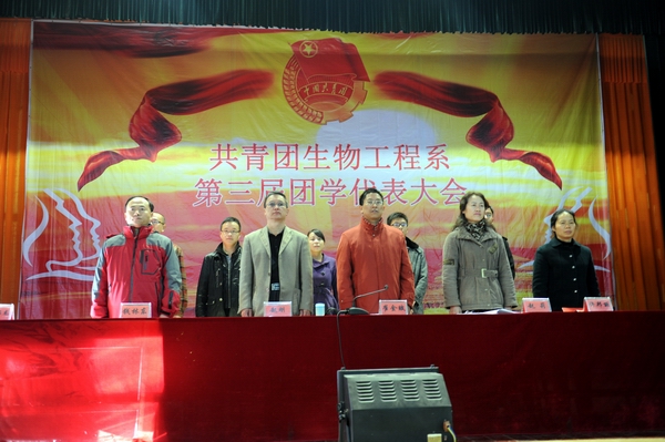共青团生物工程系第三届团学大会于11月22日在小哨大礼堂隆重召开。学院党委书记崔金赋、党委副书记赵刚、副院长赵莉,宣传部副部长蔡永生、学生工作处副处长施碧强、畜牧兽医系党总支书记钱林东、生物工程系党总支书记许邦丽、生物工程系党总支副书记兼副主任李一源,畜牧兽医系团总支书记耿立春、管理与信息工程系团总支书记李卫东、生物工程系团总支书记张蒂佐龙、生物工程系办公室主任胡琼、生物工程系招生就业科科长徐贤明等院系领导出席会议。