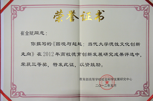 5月4日上午,由教育部高校社会科学发展研究中心举办的第四届高校德育创新发展研究论坛在山东理工大学举行。开幕式上,2012年“高校德育创新发展研究成果”评选结果揭晓,我院党委书记崔金赋的研究成果《困境与超越:当代大学德性文化创新走向》荣获三等奖。