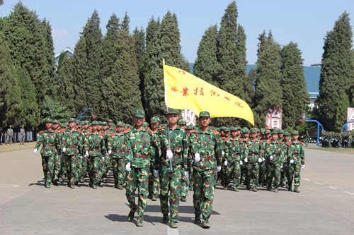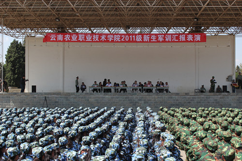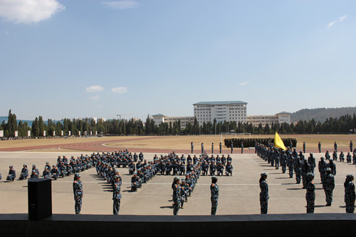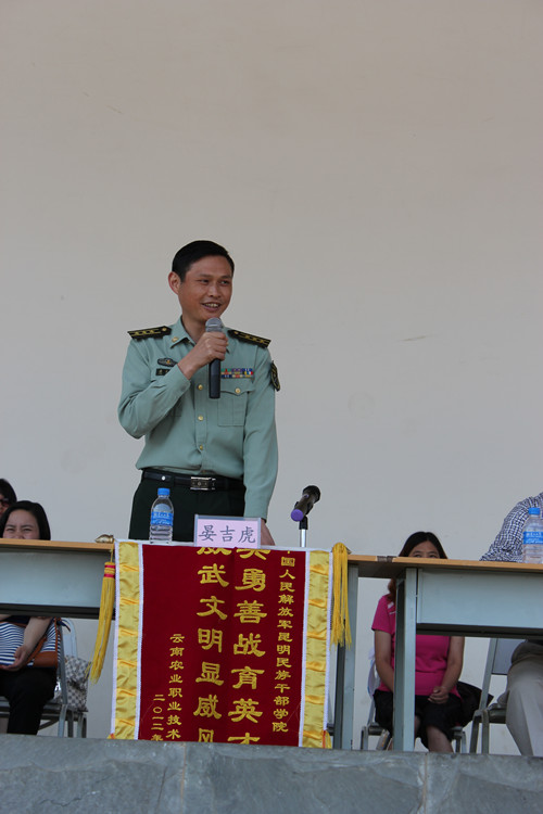 昆明民族干部学院副政委晏吉虎上校发表讲话。晏副政委指出,同学们用自己的汗水和辛劳,将15天前军训动员大会上的5个问号即:大学生为什么要军训、军训为什么要那么久、为什么要到昆明民族干部学院军训、军营生活应该是什么样的、军训会有什么收获拉成了5个大大的感叹号。晏副政委说,风雨之后现彩虹,付出就有收获,军训给每一个同学上了宝贵的一课,必将成为同学们的巨大财富,受益终生。