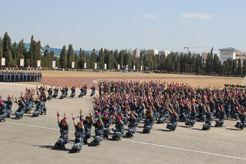 配乐奏响,汇报表演开始。女生韵律操表演方队跟着音乐的节奏舞动青春,整齐的动作,动感的表演,她们是军中美丽的花朵。男生军体拳表演方队大显身手,无论直拳摆拳,皆刚劲有力,踢、打、摔、拿等武术搏击方法招招到位。当表演卧倒时,他们毫不畏惧坚硬的地面,迅速卧倒,尽显男子汉铮铮铁骨的英雄本色。女生队列花样操表演引人入胜。她们时而表演队列基础动作,时而变化出“耕道,养德;理想,开拓”的校训,时而变化出“军”“民”等字样,象征“军民鱼水一家亲”, 彰显女子方阵巾帼不让须眉的气势。