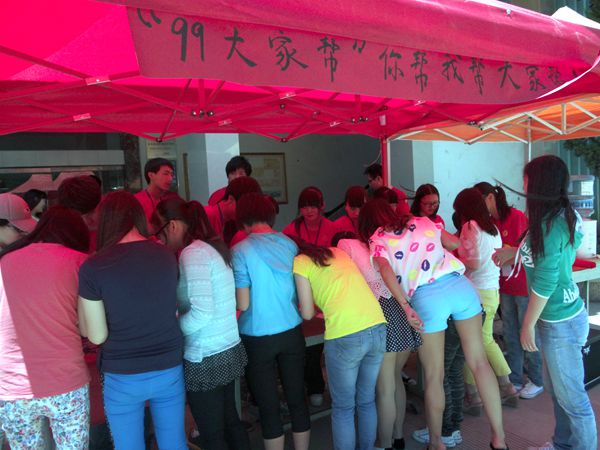 本次募捐活动迎来了广大师生以及“99大家帮”爱心社所有成员的积极参与。活动前夕,爱心社所有成员为本次活动的顺利开展做了充分的准备,做策划、发通知、找地点、拉横幅,大家用行动释放爱心,用善举托起希望。活动现场,炽热的太阳也敌不过同学们的热情,大家纷纷从宿舍拿来自己要捐赠的物品前来捐赠。爱心社的成员热情迎来捐赠的同学,细心码放,并在所捐物上贴上标签,请捐赠的同学在爱心横幅上签下爱心的见证,并以印有“99大家帮”的卡贴作为回馈。为期两天的爱心捐物活动取得了预期效果,所捐物品琳琅满目。活动尾声,“99大家帮”爱心社的所有成员进行了合影,为本次募捐活动画下了圆满的记号。