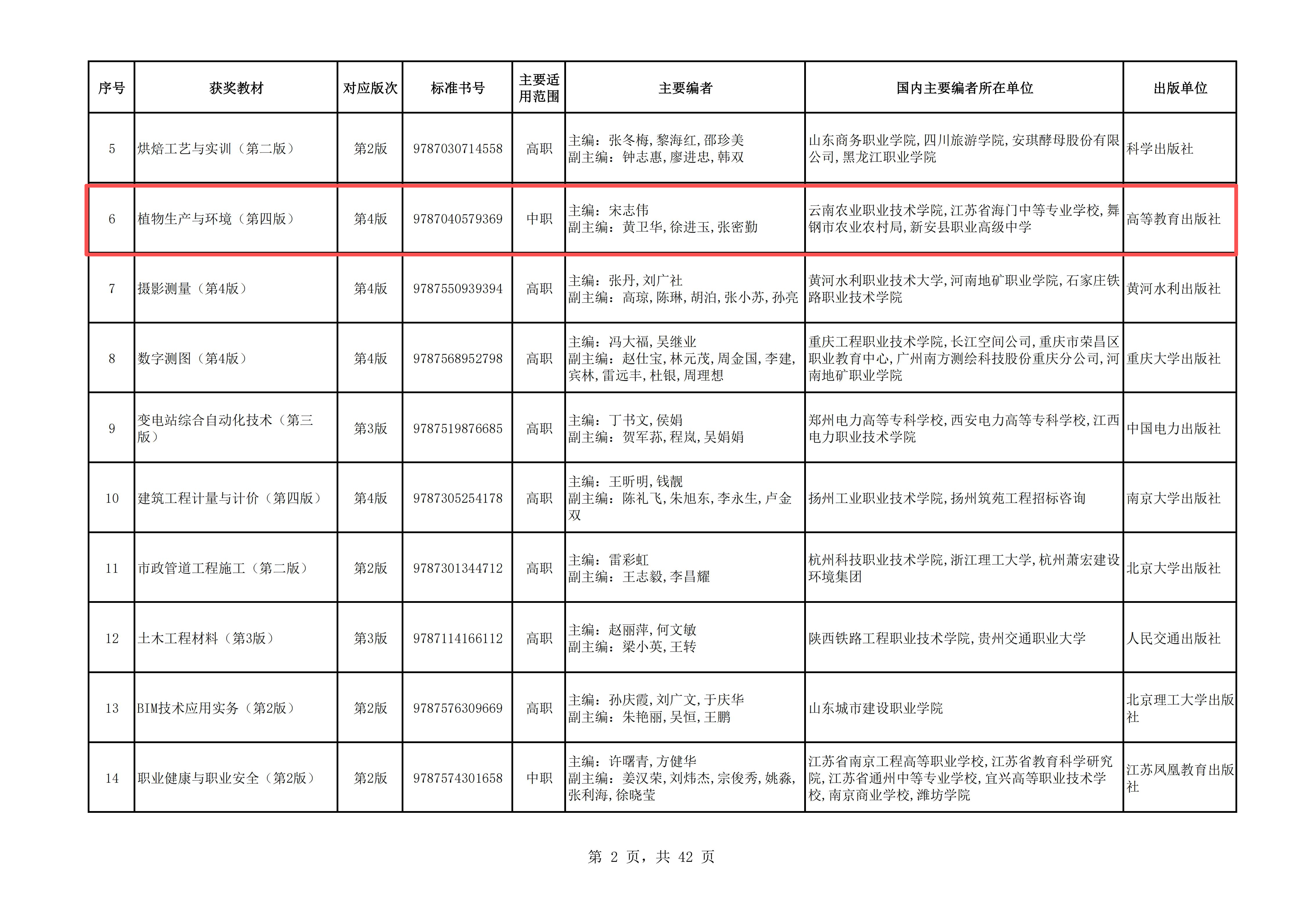 通知中心据中华人民共和国教育部官网公布的《关于第二届全国教材建设奖评选拟奖励名单的公示》《关于第二批“十四五”职业教育国家规划教材遴选结果的公示》名单,beats365宋志伟教授主编的《植物生产与环境(第四版)》(高等教育出版社)教材获第二届全国教材建设奖一等奖,实现学校在该奖项上零的突破。