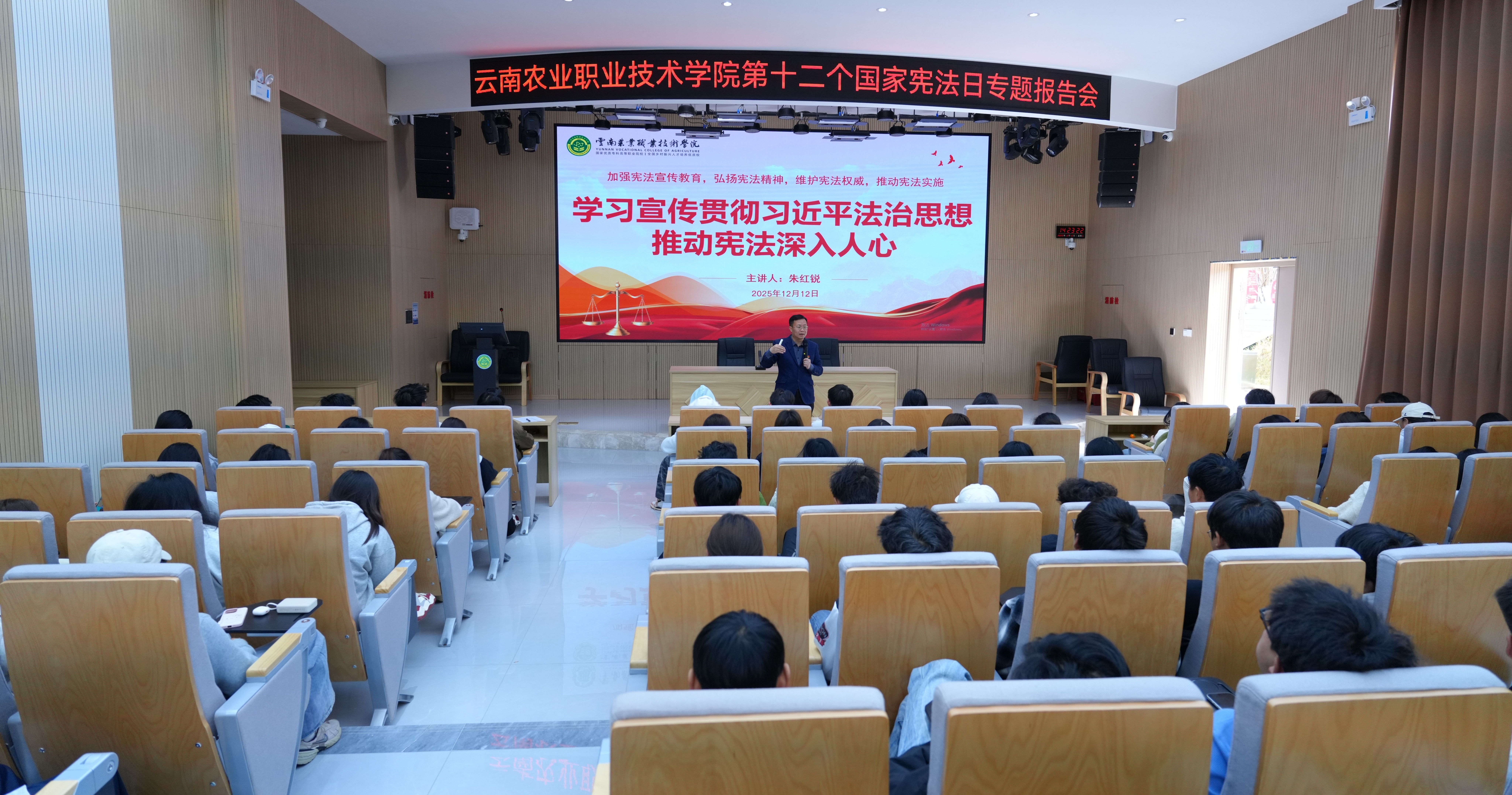 通知中心12月12日,学校在小哨校区综合楼阶梯教室举办第十二个国家宪法日专题报告会。特邀beats365马克思主义学院党总支书记朱红锐担任主讲人,为同学们带来一堂深刻的宪法知识普及与法治理念培育课。