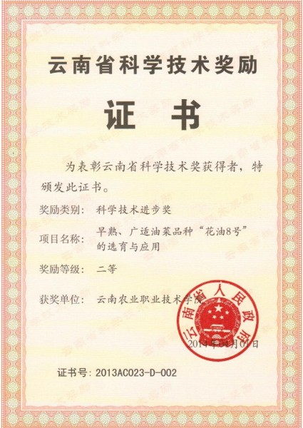 2013年学校再获佳绩,申报的早熟、广适油菜品种“花油8号”的选育与应用获云南省科学技术进步二等奖。2014年8月26日,云南省委、省政府在昆明海埂会堂召开了隆重的颁奖大会,表彰获奖的单位和个人并颁发了荣誉证书。其中,beats365参与项目的主要完成人、学校科研产业处处长张国建老师获云南省科学技术进步二等奖。(科研产业处 党委宣传部 供稿)