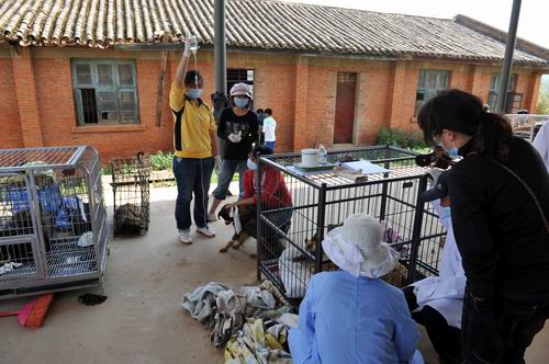 爱心组织和人士当即派人来到学院小哨校区畜牧兽医实训基地考察,认为基地虽条件简陋不尽如意,总比在市区露天不规范的护理条件好,决定把截下的400多只狗狗全部转运到小哨。4月22日下午4:00至23日凌晨3:00,爱心组织租用搬家公司的16辆车将全部狗狗转运到小哨校区临时安置点。学院畜牧兽医系成立了“兽医爱心犬救治团队”,下设“兽医组”、“护理组”、“物资保障组”,组织具有国家执业兽医师从业资格的教师拟订了救治狗狗的方案,并与爱心组织共同明确学院畜牧兽医系和爱心组织各自的责任。