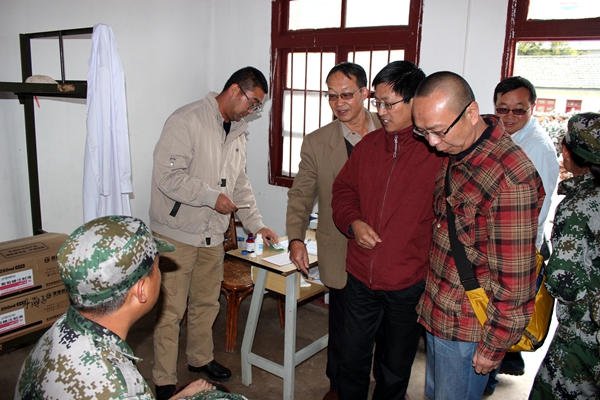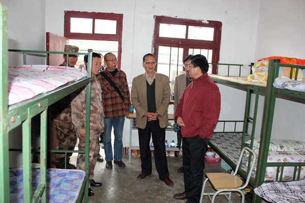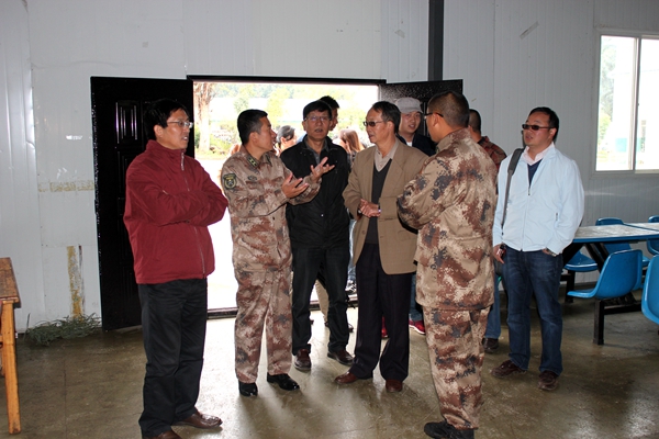 在学校保卫处李昆处长、昆明民族干部学院一大队李旭明副大队长的陪同下,崔书记一行到营地看望慰问正在紧张训练的学生。同学们非常礼貌地大声问候:“首长好,老师好!”。大家深入男女生营房察看住宿条件,察看学生“医务室”,询问受伤、生病学生的治疗情况,察看学生就餐条件等。