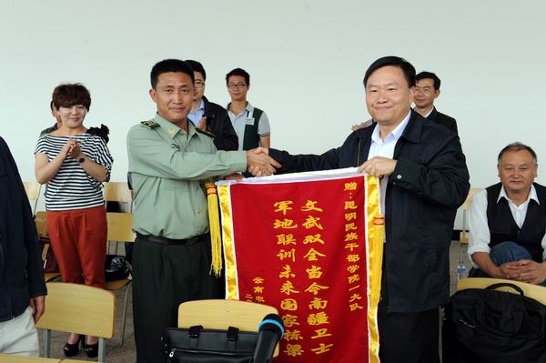 表演结束后,2012级景区开发与管理班杨珠江同学代表全体参训学员发言。随后,何明东副院长宣读了表彰决定,对军训成绩优秀表现突出的学员予以表彰。学院领导为优秀学员代表颁发了荣誉证书。随后,彭院长代表学院向昆明民族干部学院一大队司马政委赠送了锦旗,表达了我院师生对昆明民族干部学院一大队全体官兵的崇高敬意和衷心感谢。