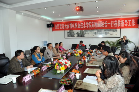 云南机电职业技术学院邹丽副院长简要介绍了机电职院的办学历史和办学规模,改革发展,以及办学面临一些棘手的问题和困难。邹副院长介绍了此行的主要目的,强调“天下职教是一家”,希望双方在办学的各个方面进行多层次的交流合作,向老大哥学校就党(院)办工作、招生就业工作等方面学习取经。