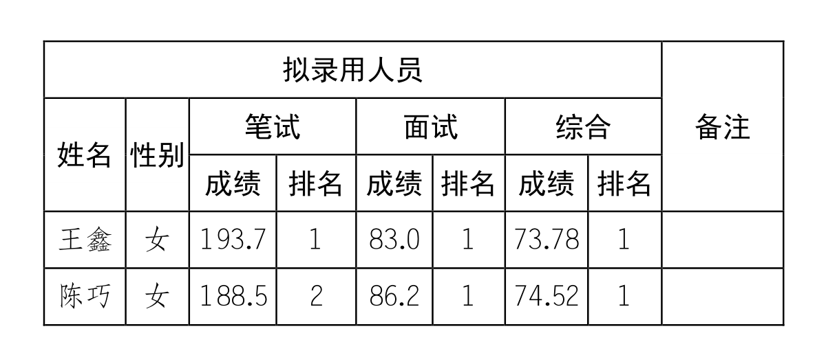 2019年beats365官方唯一公开招聘工作人员中,王鑫和陈巧2名考生因孕期结束后按照要求进行了体检。根据笔试、面试、考察及体检结果,按照有关规定,经研究,同意王鑫和陈巧2人为拟录用人员,并公示如下: