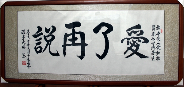 机缘凑巧,此幅书法系今年暑期台北市中国书画学会理事长、中华大汉书艺协会理事长杨蓁老先生随学院何明东副院长游小哨时,为畜牧兽医系系训“爱了再说”所作。