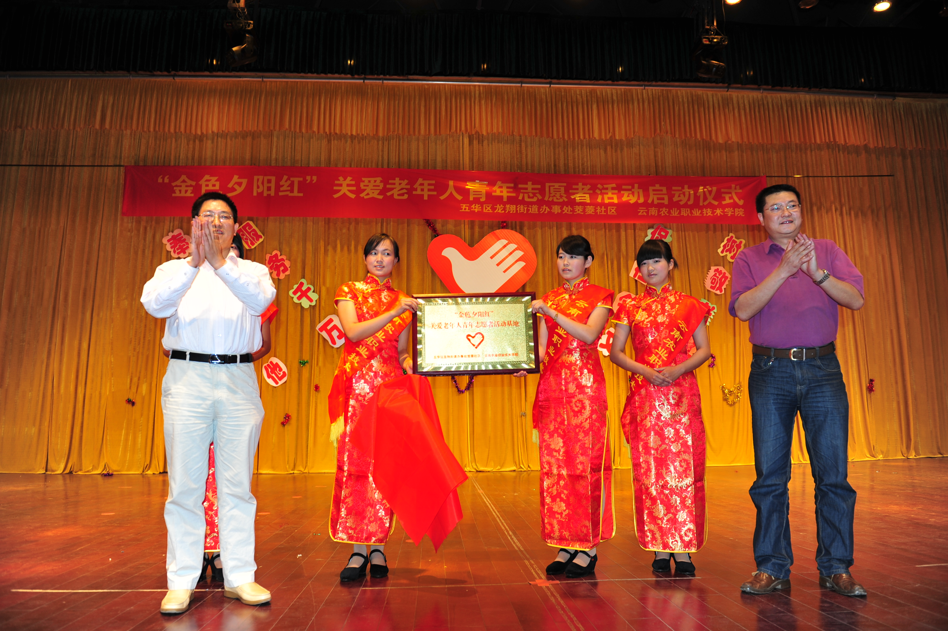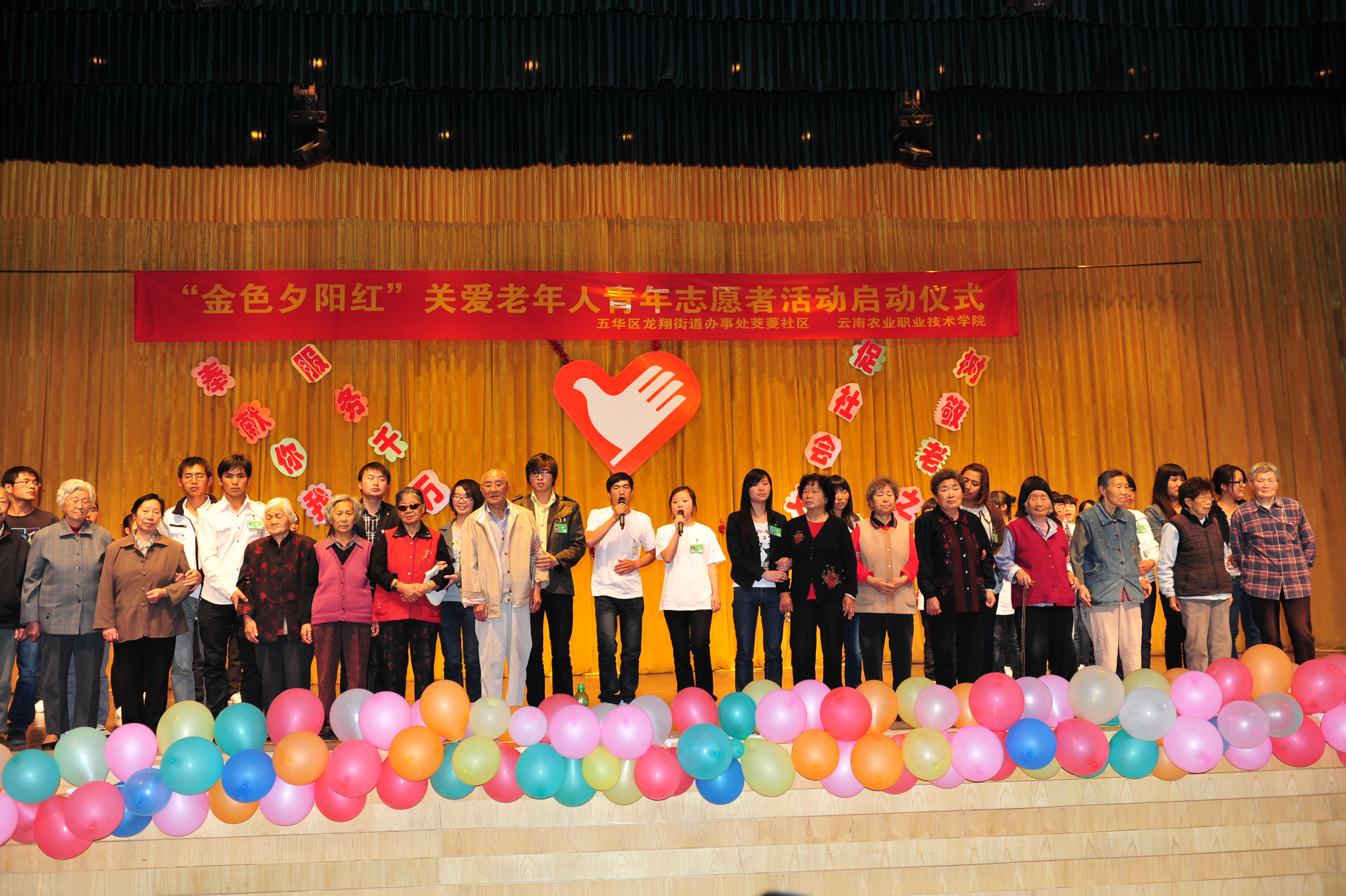 2011年5月5日下午1:00,五华区龙翔街道办事处“金色夕阳红”关爱老年人青年志愿者活动启动仪式在我院茭菱校区礼堂隆重举行。此次活动由beats365官方唯一党委宣传部、共青团beats365官方唯一委员会与五华区龙翔街道办事处茭菱社区联合举办。学院党委书记崔金赋、党委宣传部冯志宏部长、学生工作处周诚处长、学院团委书记巩佳老师,五华区龙翔街道办事处及茭菱社区的领导出席了启动仪式,茭菱社区的70位老人及我院的青年志愿者参加此次启动仪式。