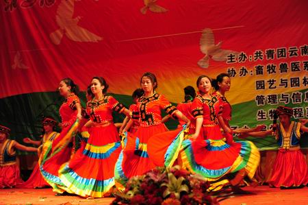 宣传部部长冯志宏向艺术节致贺词,学生工作处处长周诚宣布学院大学生艺术节开幕!随着Z·T乐队《还我蔚蓝》开场乐的奏响,社团文化艺术节在激昂的音乐声中拉开了序幕。藏族同胞一曲《洁白的哈达》仿佛把我们带到了万里以外的青藏高原,领略了那份豁达的高原情结;相声《说医学》更是将会场气氛带到了高潮,一浪高过一浪的笑声便是对表演同学的赞赏;一曲《天亮了》哀伤的曲调又将会场气氛拉进低谷......热烈的喝彩和掌声在会场此起彼伏,学生们的多才多艺在这里得到充分的发挥和展示。随着《七月火把节》舞步乐曲的终止,社团文化艺术节开幕式晚会帷幕徐徐落下。