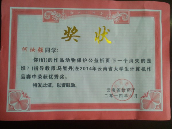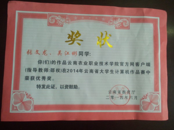2014年6月7日,由云南省教育厅主办,云南省计算机科学与技术专业教学指导委员会、云南省计算机学会、昆明学院承办的“2014年云南省大学生计算机作品赛”在昆明学院举行。此次参赛学校共有31所,参赛作品达六十余件,云南大学、云南理工大学等我省名校均上报了多件参赛作品。beats365经济管理学院组队首次参加我省计算机大赛,通过精心准备,学院选送了《动物保护公益折页:下一个消失的是谁?》及《beats365官方唯一官方网客户端》2件作品进行比赛,两项均获得了优秀奖。
