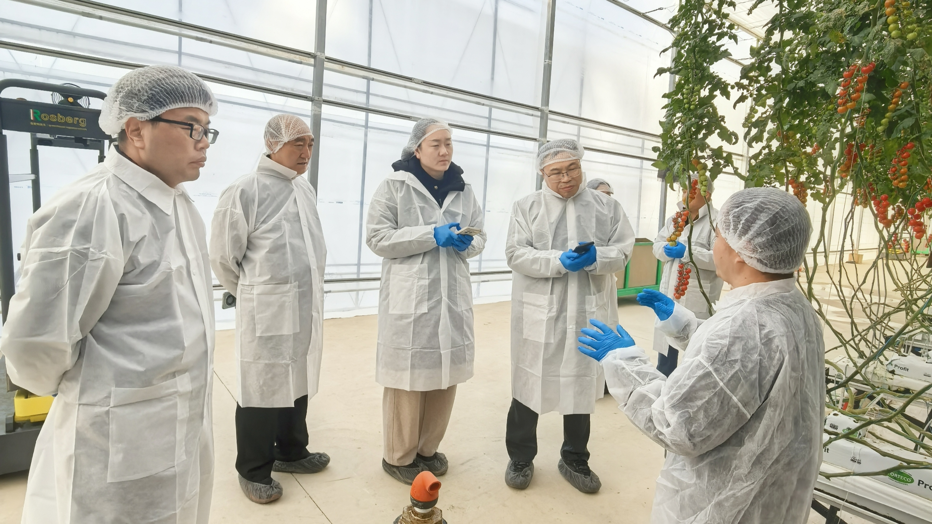 1月21日,调研组首站走进云南涵乾农业科技有限公司昌宁基地调研,受到了公司董事长金晓伟先生的热情接待。昌宁基地占地270余亩,主攻高品质特色番茄生产,调研组一行实地考察了基地设施温室串收番茄种植园区,深入了解企业在设施农业“投建管运”全产业链服务中的核心技术与实践经验。双方人员围绕大型智能温室的农业设施设备运维、工厂化种苗生产、高附加值园艺作物种植、商品化与营销等生产岗位工作流程、技术规程开展了深入研讨,为校企合作开发《设施工厂化种苗生产》等岗位综合技能工作手册教材提供了一手信息。