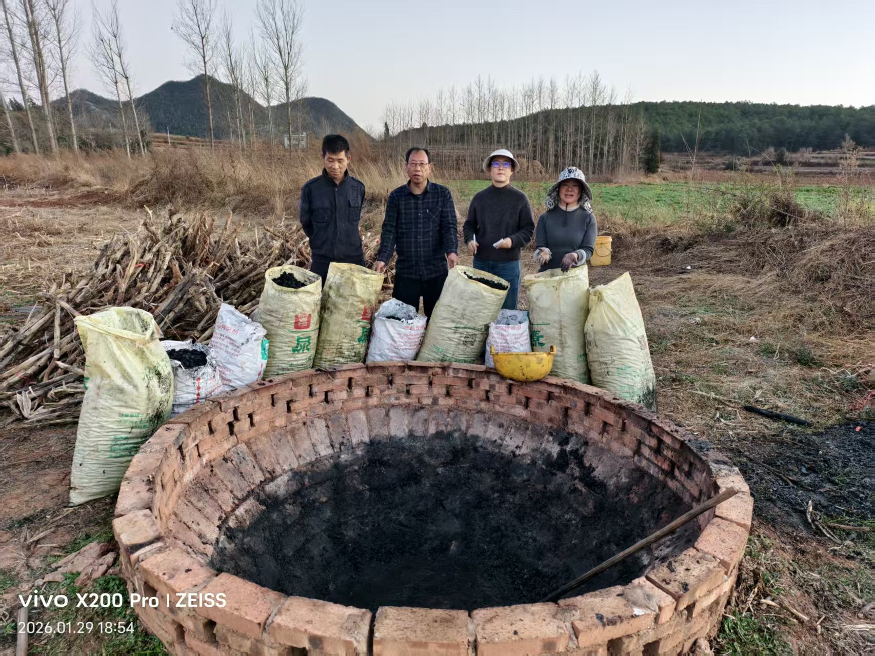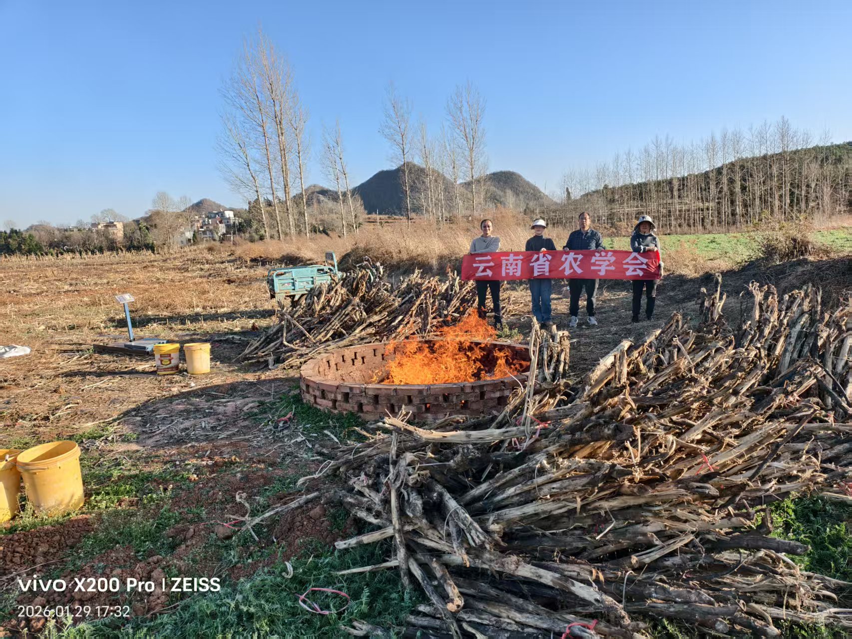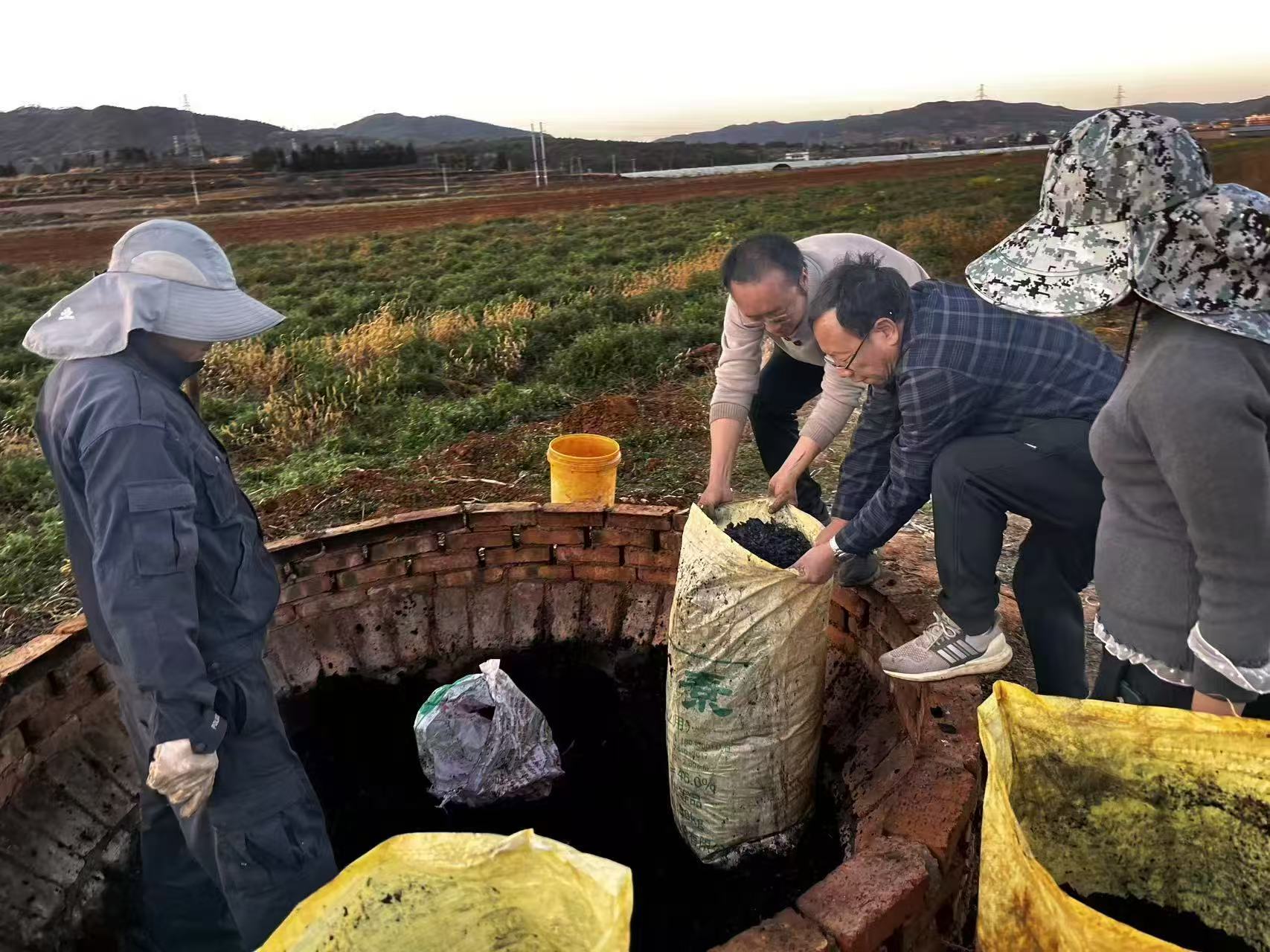 活动针对当地烤烟秋收后秸秆处理难题,开展秸秆集中焚烧示范。秸秆焚烧成生物炭后还田,改善土壤团粒结构从而改良土壤,以实现“三化”(减量化、无害化、资源化)利用。冬末的雷营村寒意未消,广袤的田地里,一堆堆烟秆匍匐着、簇拥着,似乎比其他地方的烟秆更粗大,有泡水后晒干的,成深灰色;有堆捂后晒干的,成黑色;有自然风干的,成斑白色。田边地角是一座先前建设好的、由红砖砌成的特殊窑炉,这便是科技特派员团队自主设计并建造的火焰幕砖窑。这次活动不但要焚烧完这片田地里的秸秆,还要分别取样回去做出研究分析。